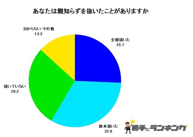 2位に「抜いていない」という回答があるものの、「全部抜いた」「数本抜いた」を足し合わせれば、半数以上は「親知らずを抜いた経験がある」という結果になります。