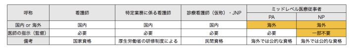 先述のPAとNPを総称して「ミッドレベル(Mid-Level )・プロバイダー(医療従事者)」という。このような資格が海外の医師偏在・過重労働対策として成果をあげていることは、ビジョン検討会の報告書でも言及されている。