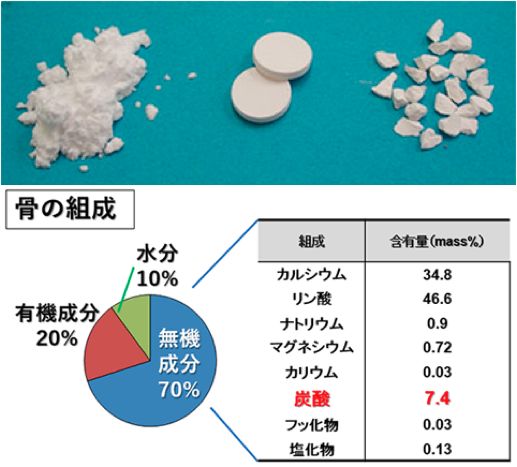 石川教授らは骨の無機成分を分析し、ハイドロキシアパタイトのリン酸基の一部が炭酸基に置換された炭酸アパタイトであることを確認。さらに、顆粒状の炭酸アパタイトの合成方法はこれまで確立されていなかったが、炭酸カルシウムを元に、リン酸塩水溶液中での溶解析出反応を用いて炭酸アパタイト顆粒を人工合成する方法を世界で初めて見いだした。