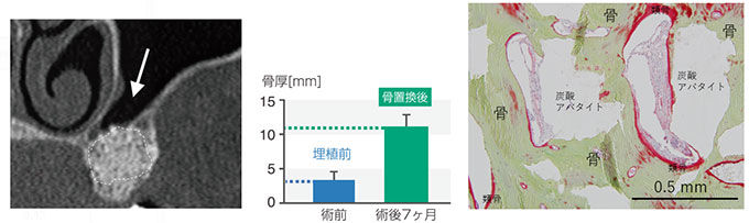 上アゴの奥歯部分にインプラントを埋入するうえで、骨が十分に存在しない22人の患者を対象にした臨床試験では、炭酸アパタイトの顆粒を移植した半年後にインプラント手術を行ったところ、すべての患者で新しい骨が形成されたという。