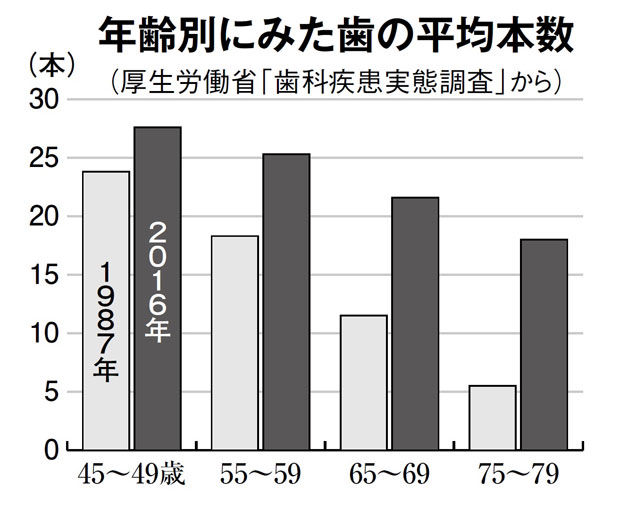 歯科医療を取り巻く環境は、大きく変わってきた。かつては虫歯の治療や入れ歯づくりが多かったが、最近は虫歯が減った。厚生労働省によると、12歳児の虫歯の数は、1989年に平均4.3本、15年は同0.9本だった。年をとっても自分の歯が多く残る人が増えている。