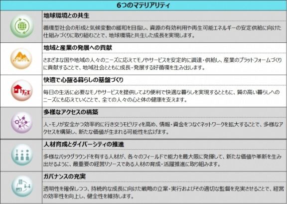 住友商事グループは『社会とともに持続的に成長するための6つのマテリアリティ(重要課題)』を、事業戦略の策定や個々のビジネスの意思決定プロセスにおける重要な要素と位置付け、事業活動を通じて課題を解決することで持続的な成長を図っていきます。本事業は、特に「地域と産業の発展への貢献」と「快適で心躍る暮らしの基盤づくり」に資する事業です。